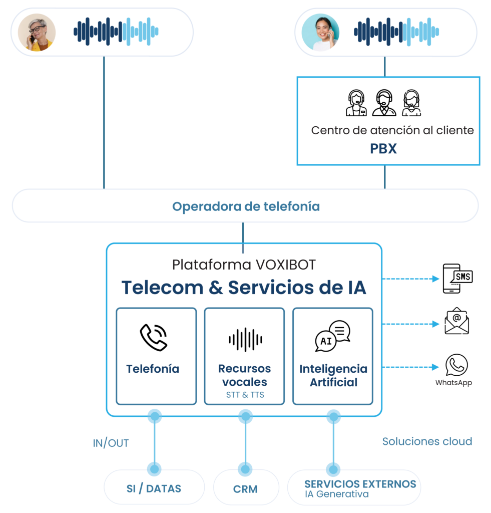 VOXIBOT permite automatizar las llamadas telefónicas con un servicio basado en las últimas tecnologías de procesamiento automático del habla y del lenguaje natural , como chatbots y voicebots.